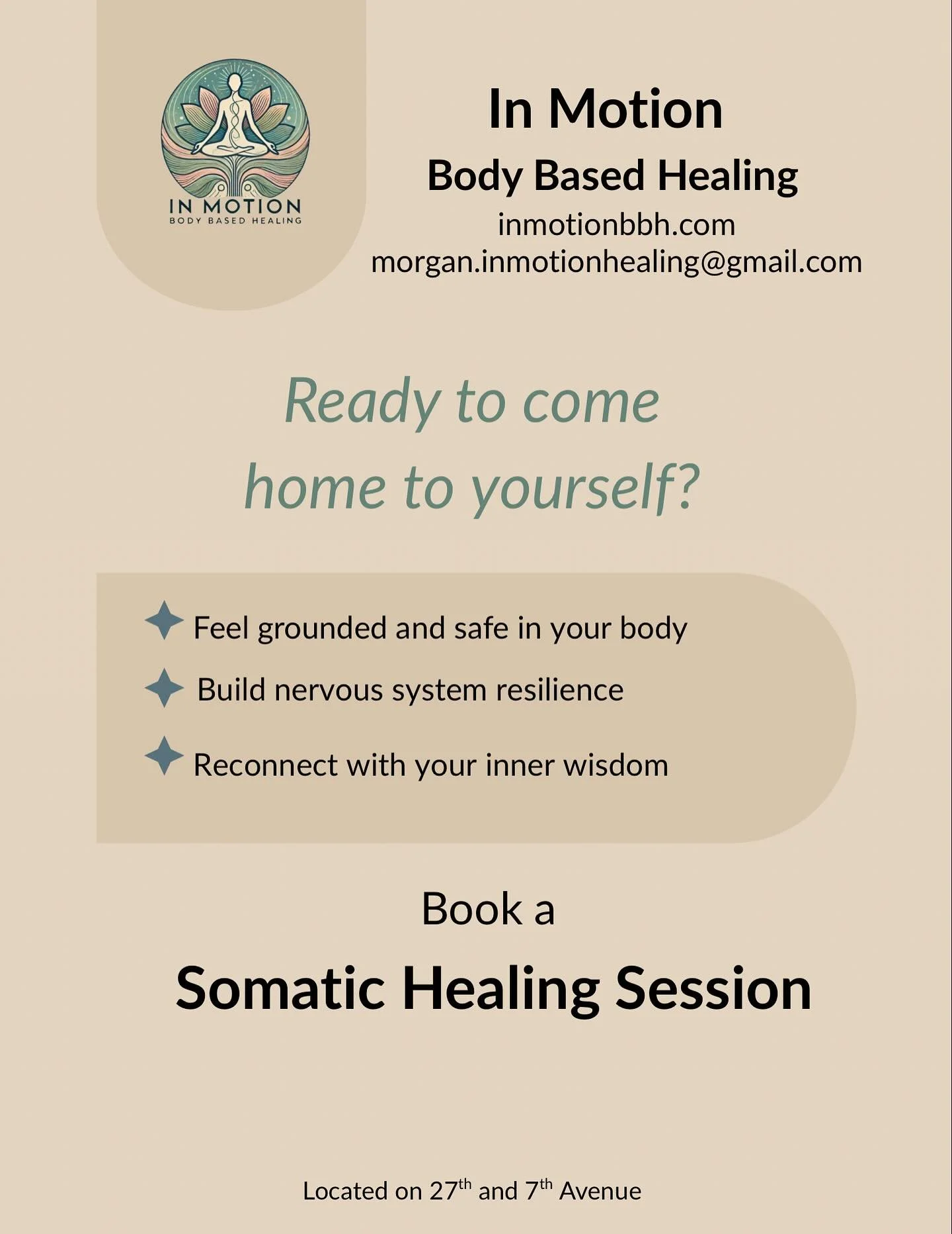In Motion Body-Based Healing, founded by Morgan Scheurich is a somatic-centered practice that supports individuals in reconnecting with their bodies, regulating their nervous systems, and healing from the inside out. Blending somatic psychotherapy, intuitive nourishment, and energy work, In Motion offers a compassionate space to explore what it means to feel grounded, whole, and fully alive in your body.